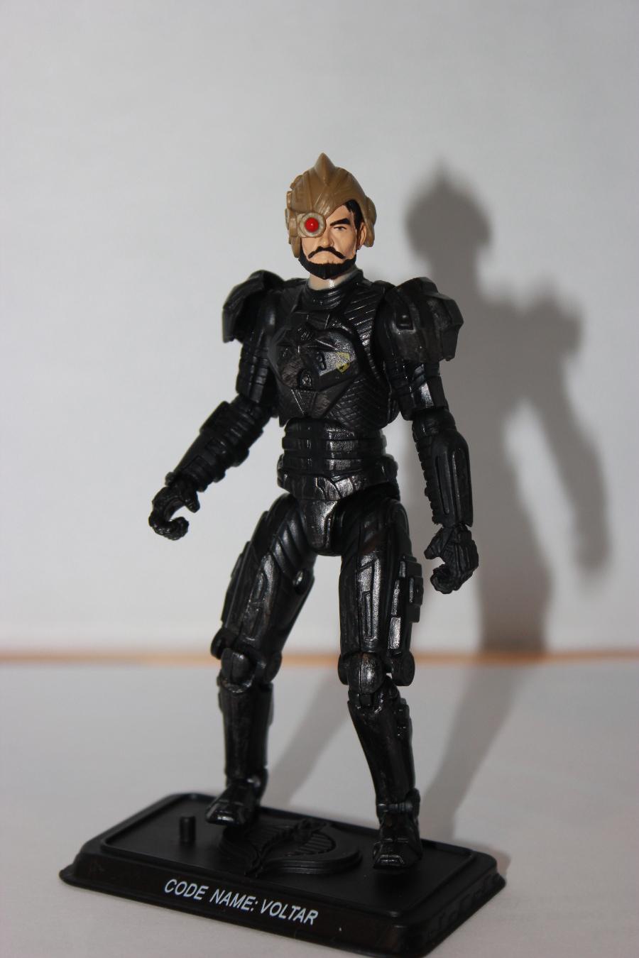 voltar1Voltar  consists of a new head and helmet, and lower legs from POC Beachhead placed on Rise of Cobra Accelerator suit body.  An Iron Grenadier belt and sword are fitting and help him blend in with his fellow Grenadiers.