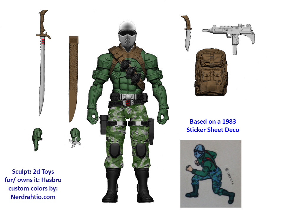 With the background info out of the way, based on that little sticker in 1983, I took Fred Azcon’s Digital sculpt for the G.I.Joe Classified line, as well as a commando style head from the Pursuit of Cobra Line, and gave him the sticker sheet treatment.