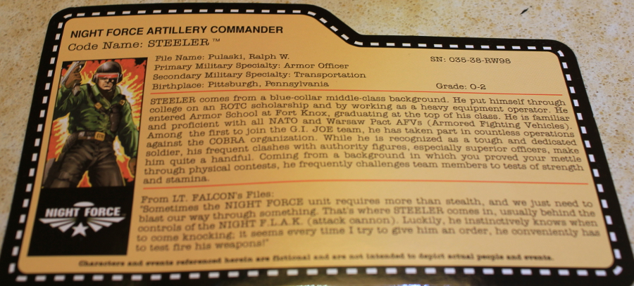 Steeler was one of the original thirteen (013) ARAH G.I.Joes but his inclusion was surprising as he wasn’t previously a member of night force.
