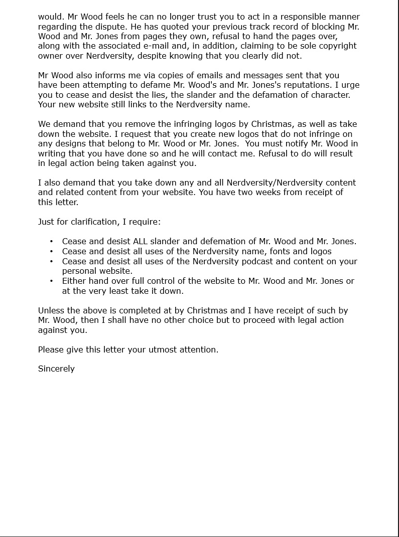This post isn’t linked anywhere on the front page, if your here, it should be because I sent you a link to look at it. The current claims are, I was never a part of nerdversity101’s creation, was never a partner, and that my former associates never demanded I give them the .com. It has also been stated they haven’t harassed me, but somehow I have slandered, labeled or harassed them.